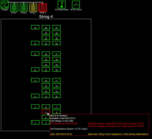 - Displays total battery voltage, unit voltage, unit impedance, ambient and battery case temperatures